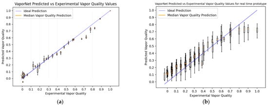 VaporNet predicted values vs. experimental values: (a) using offline data processing; (b) deployed on the laboratory prototype, collecting live data.