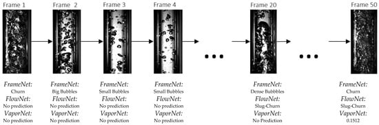 A key aspect of the architecture is its use of separate classes for image frames and frame sequences. It was observed that images with highly similar features occur across multiple flow regimes. When training a network that classifies frames based upon flow regime classes, the inter-class confusion is high because of these similarities. It is also observed that an individual’s perception and definition of flow regime is not only characterized by the spatial distribution of the gas and liquid within the two-phase flow but also by the way in which it changes over time. For instance, a transitional flow regime might appear distinctly as one flow regime in a single frame, but it is defined as transitional on the basis of how the flow behaves across multiple frames. This means that temporal information must be key for image-based flow regime classification. Combining these two observations, a novel method to achieve flow regime classification is developed, where a sequence of frame features is used to predict the flow regime. Similar network architectures have been implemented in other tasks related to image sequence analysis [35,36,37].