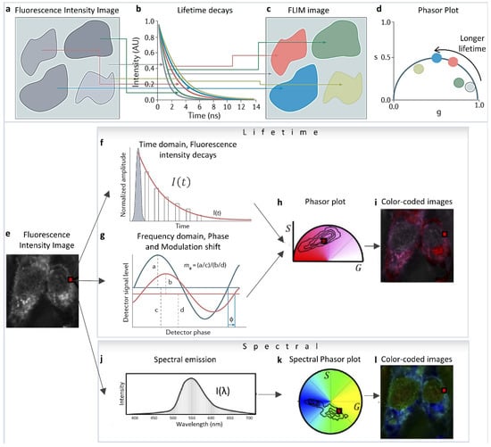The phasor approach to fluorescence lifetime and hyperspectral imaging has expanded applicability and the quantitative aspect of fluorescence analysis due to its ease of implementation and its capability to simplify and handle a large amount of data [1]. The mathematics were originally formulated by Weber et al. [2], then it was first implemented by Jameson et al., for fluorescence lifetime measurements in 1984 [3], and in the early 2000s by the Gratton [4,5,6,7,8] and Clegg labs [9,10,11] in Fluorescence Lifetime Imaging Microscopy (FLIM). They showed the simplicity and easy applicability of this technique in Förster Resonance Energy Transfer (FRET) [7,12,13,14,15,16] and autofluorescence metabolic FLIM imaging [5,6,17,18,19,20,21,22,23,24]. Different areas of the fluorescence image (Figure 1a) can be identified by their difference in fluorescence lifetime decays (Figure 1b). The lifetime decays and their phasor representation (Figure 1d) can then be used to separate areas of the intensity image according to their lifetime (Figure 1c) and add information depth and dimensions to the simple fluorescence image. Phasor plots are fit-free methods for data analysis and interpretation that involves transforming fluorescence decays (for FLIM, Figure 1e–i) and spectra (for hyperspectral imaging, Figure 1j–l) to the Fourier space [1,4,25,26]. In FLIM imaging, this operation means calculating the phasor coordinates (Figure 1h) from the decay at each pixel (Figure 1a–d [27]), either from the time domain intensity decays (Figure 1f) or the frequency domain measurements (Figure 1g). Please see [28] for more details and historical perspective. This calculation results in individual decay components being additive in the Fourier space (phasor space) [29] because of the validity of vector addition properties. In both phasor FLIM or spectral phasor cases, a single pixel can have components from multiple species, and the linear addition properties allow for the separation of these components. This statement is different from the scenario wherein the components are spatially segregated in different parts of the image—as the corresponding phasor points from those different areas will be segregated in different parts of the phasor space [1]. The focus of this review is to highlight how the linear addition properties of the phasor space can be used to identify and understand changes in biological samples and how to use the phasor transformations for the quantification of various fluorescence moieties in images.
