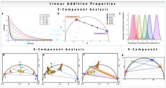 In a two-component system, wherein the resulting phasor points have two individual decay components, the position of the resulting phasor lies on the line joining the phasor positions of the individual components (Figure 2a,b). Increasing fractional intensity of one component brings the phasor cloud closer toward that component (Figure 2b,c). In a three-component system, the position is within a triangle whose vertices are the phasor positions of the individual components (Figure 2d–f) [31,32]. This approach can obviously be expanded to any number of components and polygons (Figure 2g) [35], with the only caveat being that one of the contributing species’ phasor positions cannot be along a line joining two other contributing phasor positions. The other important thing to remember is that the component deconvolution requires high precision for the calculation of the phasor position from the image which related to the signal to noise (S/N) ratio. The deconvolution calculation does not add large uncertainties in the component calculations, but the inherent S/N ratio can be carried over to the final analysis [35]. High signal to noise ratio of the image acquisition results in improved calculation of the components.