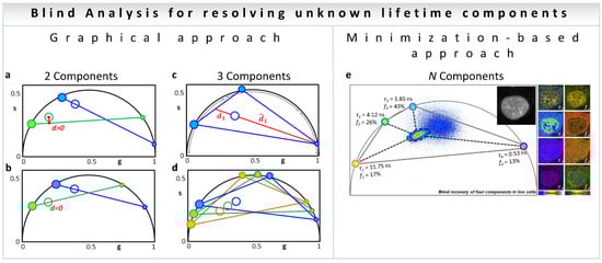 Blind component analysis for resolving unknown lifetimes in phasor plot—assuming the components have mono-exponential lifetimes. (a,b) Graphically finding two unknown lifetime components and their relative fractional intensities. (a) Universal circle is scanned for candidate components. For each position of the first component (small blue dot), a line is drawn through the data point (blue empty circle) and the second point is found where the blue line meets the universal circle (large blue filled circle). The second harmonic (h2) for the candidate components are obtained mathematically: small green dot and the large green filled circle. A line is drawn through them (green line). (b) Solution is the only lifetime pair that has the lines (blue and green) going through the data points for the two harmonics, that is, when the distance from the green line to the green empty circle is zero. The relative fractions are obtained by the ratios between the distances from the filled dots to the empty circles on both sides of the line. (c,d) Finding the three lifetime components in the universal circle. (c) Schematic configuration of three components generating a data point (ring in the middle). As an example, the ratio between the two distances is related to the intensity fraction (f) of the component located in the short lifetime region; f1 = d1/(d1 + d1). In the same manner, the other two fractions can be obtained for the other two components. (d) Solution to the three-component problem is the only combination of components such that the three fractions are the same in each of the triangles composed of the three harmonics (blue–green–orange). The short, medium, and long lifetime components in each harmonic are depicted by increasingly larger filled circles. (e) Minimization-based approach. This general algorithm can technically be solved the problem to N number of components depending on noise propagation in the multiple harmonics. (Panels a–e adapted with permission from [38]).