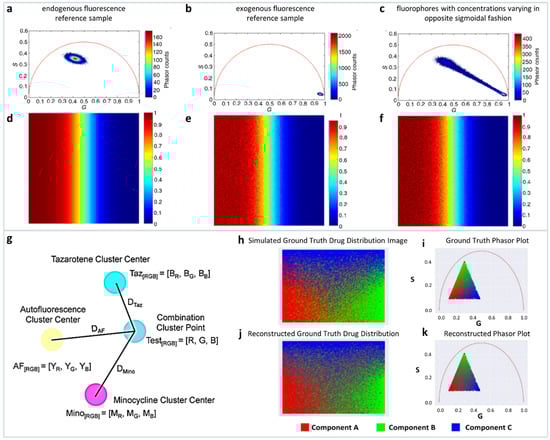 Multicomponent analysis based on non-Euclidean geometry. (a–c) Simulation to validate the proposed non-Euclidean separation algorithm. (a) Phasor plot of simulated endogenous fluorescence reference sample, (b) exogenous fluorescence reference sample, (c) fluorophores with concentrations varying in opposite sigmoidal fashion. (d–f) Three-component analysis of drug distribution using non-Euclidean geometry. Simulated endogenous fluorescence contribution to the test image. Estimation of endogenous fluorescence contribution computed using the traditional Euclidean method and using the proposed non-Euclidean method. (Panels a–f adapted with permission from [37]). (g–k) Distance-based method of assigning phasor plot pixel colors in a multicomponent fluorescence contribution analysis algorithm. (g) A sample setup of a distance calculation. Yellow, cyan, and magenta points → the center of exogenous (autofluorescence), and two endogenous reference clusters (TAZ and MNC), respectively, and blue point → a phasor point from the tissue sample. (h,i) Simulated ground truth tissue map of drug distribution and calculated phasor plot. (j,k) Reconstructed tissue drug distribution using the multicomponent phasor analysis algorithm and phasor plot. (Panels g–k adapted with permission from [36]).