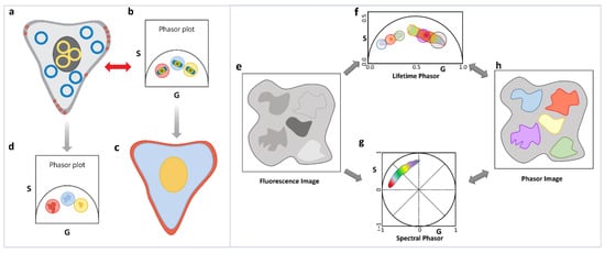 The multidimensional phasor approach is based on this reciprocity principle. If multiple phasor properties can be calculated for the same image (Figure 6e), e.g., lifetime and spectral phasor (Figure 6f,g), then the reciprocity principle allows for selection of a set of phasor points in one dimension (let us assume lifetime, master phasor). This results in the image pixels those phasors originated from being highlighted (Figure 6h), and finally the properties of those image pixels in another dimension are shown (in this case spectral [26,41], see Section 6.2). Using this approach, we can combine excitation-emission spectra, many lifetime channels, as well other dimensions such as diffusion phasor or anisotropy/polarization. Thus, the reciprocity principle can enable us to ask questions about multiple different properties of the various fluorescent species and can help us to possibly identify various species by combination of their various spectroscopic characteristics. The possible applications, including autofluorescent species in biological systems, can possibly let us fingerprint various species.