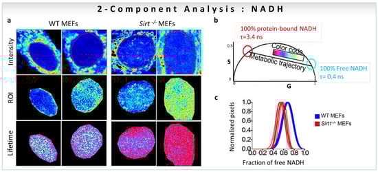 One of the first studies to quantify the fractions of individual components based on linear additive properties of phasor-FLIM focused on the role of the NAD-dependent deacetylase SIRT1 in the subnuclear distribution of free and protein-bound NADH [17]. FLIM images of WT vs. Sirt1−/− MEFs in the cell nuclei were taken with an NADH filter (460/80 nm) to collect the contribution from free NADH (0.4 ns, cyan/white circle) and protein-bound NADH (3.4 ns, red circle), and avoid FAD fluorescence (Figure 7a,b). Figure 7b shows the positions of NADH species on the universal circle in the phasor plot, and the color-code used to visualize the metabolic trajectories. The use of the two-component graphical analysis (for calculations, see Section 3.1) of the FLIM data allowed a comparison between the relative fractional intensities of free and protein-bound NADH in WT and Sirt1−/−-MEFs (Figure 7c). The fraction of protein-bound NADH is significantly higher in Sirt1−/−MEFs compared to WT MEFs (Figure 7c). Additionally, NADH subspecies are distributed in distinct nuclear territories with protein-bound NADH located at the nuclear periphery, whereas free NADH concentrates in the nuclear interior (Figure 7a). The absence of SIRT1 reorganizes NADH metabolism in the nucleus (Figure 7a). The conclusion is that NADH has a specific distribution in the nucleus, and that nuclear NADH metabolism is associated with SIRT1 function.