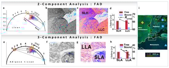 As we have mentioned, many reports have been published on the variations in metabolic pathways revealed by NADH FLIM, but this is not the case for FAD. Recently, FLIM FAD autofluorescence combined with the phasor approach has been used by Shen et al., to evaluate pathological features of metastatic colonization of pancreatic cancer [48]. FAD shows a reverse tendency compared to NADH, has a long lifetime in the free state (3–4 ns) and a shorter lifetime in the protein-bound state (<1 ns, Figure 9a). FLIM intensity images of hepatocytes and cancer cells of metastatic pancreatic cancer are shown in Figure 9b (intensity image), and the phasor color-coded image in Figure 9c. Images were taken with an excitation wavelength of 450 nm and an emission filter of 550/40 nm to collect the fluorescence from free FAD (~4 ns, orange circle) and protein-bound FAD (<1 ns, cyan circle) avoiding NADH fluorescence (Figure 9a,b). Again, a two-component analysis (for calculations, see Section 3.1) of the phasor plot was performed to obtain the FAD free-to-protein-bound ratio. A shift towards free FAD along the metabolic trajectory was observed, indicating a change from oxidative phosphorylation to glycolysis, which the authors suggest is related to cancerous behavior of the cells (Figure 9d). In adipose tissue of metastatic pancreatic cancer, long-lifetime species (~7.8 ns) were also observed in the FAD channel (Figure 9e–h). In this case, a three-component decomposition (for calculations see Section 3.2) was performed, and an increase in the fraction of free FAD was observed (Figure 9h). Figure 9i shows whole-area analysis of free/bound state of intracellular FAD metabolism in the tumor microenvironment, where cancer-associated optical signatures were associated with FLIM. These metabolic features demonstrate that changes in metastatic colonization can be probed by the characteristic parameters of free and protein-bound FAD.