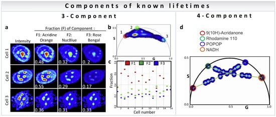 Resolution of the fractional intensities of four components in one pixel is possible in FLIM images using the phasor approach with a simple algebraic algorithm developed by Vallmitjana et al. [35]. This method is based on the law of linear combination of components that is valid after transformation of the decay curves to phasor space for each pixel in the image. For four-component decomposition, the phasor position of all individual molecular species has to be known for both first and second harmonics, available using modern electronics (for calculations see Section 3.3). Figure 10d shows measurements of mixture of dyes of different chemical compositions and lifetimes: 9(10H)-Acridanone (12 ns), Rhodamine 110 (3.8 ns), POPOP (1.4 ns), and NADH (0.4 ns), where the mixture at the center of the four green lines was obtained by adding four components of equal fractional intensity. Using linear algebra, it is possible to resolve four components in one pixel given the position of the phasors of four independent components in mixtures of dyes.