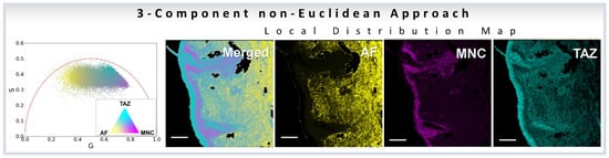 Similarly, the three-component analysis using non-Euclidean approach (Section 3.5) has been used to understand the effect of dyes in skin. In the first paper the authors used a three-component analysis to understand the effect of chemical sun filters, i.e., active ingredients of sunscreen lotions, to understand the topical distribution of the sun filters in ex vivo skin samples [37]. In the second work the same authors used the three-component analysis for understanding penetration and distribution of a topical gel (BPX-05), that can be used to treat moderate to severe acne vulgaris by delivering the active ingredients: topical antibiotic minocycline and the retinoid tazarotene directly to the pilosebaceous unit of the dermis. Here, minocycline (MNC), tazarotene (TAZ), and autofluorescence from NADH were treated as the three components [36] (Figure 11).