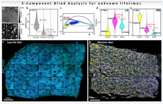 The biological problem of determining the free-to-protein-bound NADH ratio in the presence of LLS was addressed using a blind three-component decomposition [38]. The method uses the phasor approach and measurements of the decay at phasor harmonics 2 and 3. The blind component algorithm was performed in mice liver samples fed with low-fat (LF) or Western diet (WD) that causes lipid droplet accumulation in liver (Figure 12a, for calculations see Section 3.4.2), and the three median recovered lifetimes were [38] 10.0, 3.8, and 0.4 ns (Figure 12b). The lifetimes are displayed as colored circles on the universal circle on the phasor plot in Figure 12c. The three distributions are close to the expected lifetime values 7.8, 3.4, and 0.4 ns, previously shown in this review in Figure 7b and Figure 8b, proving that the blind component analysis can calculate correct lifetimes for the emitting species without knowledge of the system. Afterwards, the three recovered lifetimes were used to calculate the fractional intensity contribution of each of the components in every pixel of the image (LF; Figure 12d, WD; Figure 12e), finding that LLS are 8.6 times more abundant in the WD liver than in the LF as previously reported (Figure 8d, [32,33]). The three recovered fractions were finally used to obtain ratios of free/bound NADH excluding the presence of the LLS (medians of the value shown in red Figure 12d,e). The free NADH ratios obtained were 41% for LF and 27% for WD, meaning that there is more protein-bound NADH in the WD liver than in the LF. Images in Figure 12f,g are color-coded using a colormap (magenta to cyan on the phasor plot, Figure 12c) along the metabolic trajectory, for the ratio between the free and bound NADH lifetimes, on which the presence of the LLS were overlaid with a semitransparent yellow layer for the LLS fraction over 75%. This blind analysis can then be used to obtain quantitative information from phasor-FLIM images, including quantification of LLS, which are a signature of lipid oxidation that is present in fat droplets. Moreover, this new analysis allows for quantification of changes in metabolism even in samples where the third species (LLS here) modifies the phasor plot.