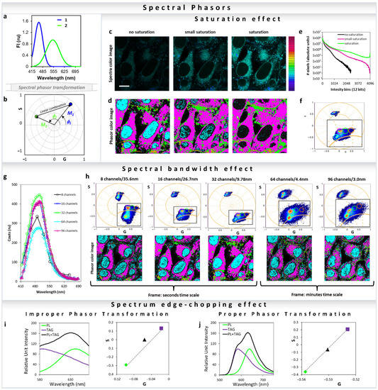 All major fluorescence microscopy vendors offer different arrangements for hyperspectral detection. Companies such as Nikon and Zeiss use PMT-arrays with different number of actuators (16 to 32 channel), which results in parallel collection of all spectral colors during the same dwell time and with a single illumination process. Other companies use single or two detectors to collect the emission spectra in steps with variable windows (Leica and Olympus). In this last example, the collection of the spectra takes longer because each step of the image is recorded individually, resulting in n numbers of decided illumination steps, where the resolution of each step can be defined by the users. One last option is the use of a spectrograph and a camera, when emission light is projected as a line in a camera chip and the resolution reaches 1 nanometer. In all cases, the light is split by a dispersive element such as prism or grating and then projected to the PMT-array, camera or to a PMT. Traditionally, the analysis of the spectral data requires methods such as component deconvolution or principal component analysis. In all of these analysis methods, knowledge about the system in study is required, and regardless of the methods used, either a physical or a mathematical model is assumed. In the spectral phasor space, no assumption is needed and analysis (Figure 13a) is model-free, similar to the phasor for the time-resolved fluorescence. Any spectra should have a position in the four-quadrant phasor plot, which is related to the center of mass and FWHM [1] (Figure 13b) (Equations (13) and (14)). It is simple to obtain the fractional intensities of each component when the positions of the single components are known, using the method described in Section 3 for the lifetime [32,35]. However, the most important applications are in situations where it is not trivial to obtain the “pure” component, and therefore use of regular deconvolution is impossible and/or inappropriate. For instance, with solvatochromic probes such as LAURDAN and Nile Red, there is no possibility to reproduce the exact environment present in cell membranes or lipidic organelles [26,43,44,45,56]. Before highlighting this application, let us cover some important considerations needed for a proper spectral phasor transformation. One very important and easy to understand consideration for improper transformation is to avoid saturation in spectral acquisition. Considering all new instruments that enable 16 bits resolution (65536 intensity values) it is very hard to saturate a pixel, but still it is recommended to acquire images with an active histogram or high–low function to avoid making this irreparable data mistake. In Figure 13c, one can see the effect on the phasor cloud distribution and position due to different levels of saturation. Increasing saturation can cause abhorrent phasor transformation loss of sensitivity (Figure 13c–f). The effects of the spectral bandwidth on the spectral phasor transformation are shown in Figure 13g,h. The phasor mapped images and the graph (Figure 13g) show that in Zeiss LSM 710 32 channel spectral detection gives the best result. This is due to the fact that there is an optimum number of channels which gives the best phasor transformation. Increasing numbers beyond that decreases signal to noise (S/N) in each channel, to an extent that the phasor cloud becomes broader.