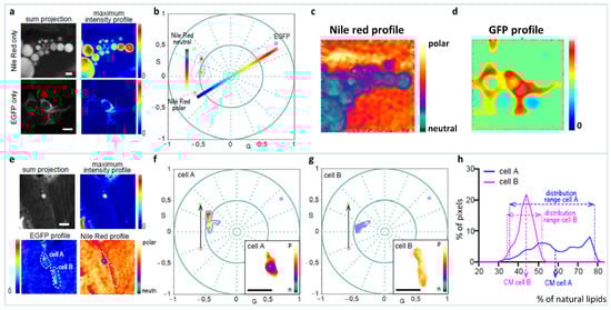 Analysis of the lipid metabolic profile of EGFP+ cells in the zebrafish line with the transgene fabp4 (−2.7): EGFPcaax. (a–d) Schematic representation of the three-component analysis for the Nile Red fluorescence in the presence or absence of the EGFP fluorescence. EGFP− cells let us define the neutral-polar Nile Red trajectory and EGFP+ cells without Nile Red, allowing us to identify the phasor position of the third component (GFP, identifying the specific cell-adipocyte). Notice that after three cursors were defined, a triangle has all possible linear combinations, and the third component was used to analyze the Nile Red information from the cells of interest. Two scales of colors were defined for the Nile Red profile and the EGFP profile. (e–g) Examples for the analysis of the Nile Red profile in two cells from the zebrafish larvae with the transgene fabp4(−2.7): EGFPcaax at 8 dpf. Notice that the Nile Red spectrum characteristic in the EGFP+ cell is pulled towards the third component, which enables the identification and analysis of the Nile Red profile for these cells avoiding confusing the information coming from Nile Red in GFP− tissue. (h) “Nile Red axis” is defined as a normalized fraction of pixels along the Nile Red profile. The histogram shows the percentage of polar lipids in the region of the cell analyzed. Scale bars: A: 20 μm; B: 50 μm. (Panels adapted with permission from [56]).