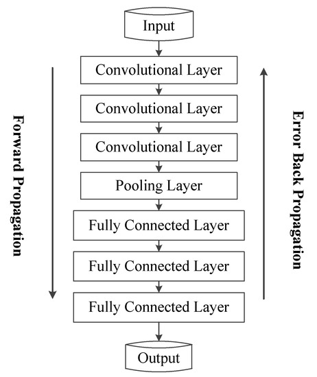 The error backpropagation part of the fully connected layer is the same as the traditional feedforward neural network’s. The pooling layer does not contain any parameters or learning process, so there is no need for parameter derivation and gradient descent update in the pooling layer, and the backpropagation in the convolutional layer needs to take into account the size adjustment [22]. Backpropagation is performed after forward propagation to correct the convolutional kernel and fully connected layer parameters of the CNN model until the specified number of iterations is reached.