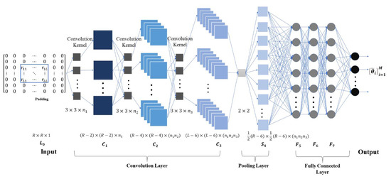 When a signal arrives in a certain direction in space, its position number in the discrete set is ; otherwise, . Therefore, the DOA estimation problem is converted into the inverse mapping of the array output covariance matrix to the position ordinal of the corresponding nonzero element in the discrete set. In this paper, the DCNN model is designed to solve the DOA estimation problem, in which the array output covariance matrix calculated by the array output signal vector obtained by Equation (7) is the input of the DCNN model, which is: