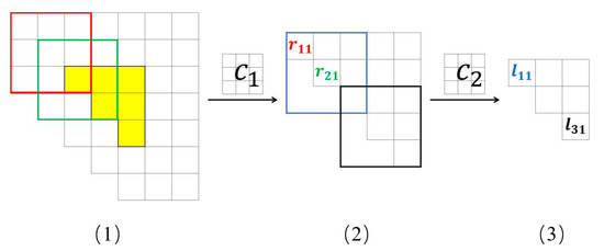 (1), (2) and (3) in Figure 3 denote the form of the data before and after the convolution operation, respectively. The yellow part of (1) denotes the upper triangular array of the covariance matrix of the neural network input expressed above, and its white part denotes the padding part. The red and green matrices in (1) are convolved with respectively, and the results obtained correspond to and in (2). Similarly, the blue and black matrices in (2) are convolved with and the results obtained correspond to and in (3).