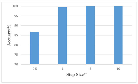 In determining the discrete angle interval, the effect of step size on the resolution of DOA estimation, accuracy, and the time-space cost of model training is considered. In this paper, 0.5, 1, 5, and 10 are used as discrete angle intervals (i.e., step size) for training, respectively. The step size is the resolution size, and the smaller the step size, the higher the resolution; in terms of accuracy, the model accuracy increases with the step size, as shown in Figure 5 below.