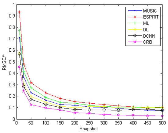 The snapshot number is the number of sampling points of each array element in the time domain, and usually, the snapshot number will have some influence on the DOA estimation performance. In this set of simulation experiments, keeping the other simulation parameters constant and the signal-to-noise ratio (SNR) as 10 dB, the array-received data with snap counts of 10, 25, 50, 100, 150, 200, 250, 300, 350, 400, 450, and 500 are designed for simulation experiments, and the MUSIC algorithm, ESPRIT algorithm, maximum likelihood, Deep Learning (DL) algorithm, and DCNN method proposed in this paper are used to perform DOA estimation and calculate the RMSE values. In addition, the Cramer–Rao bound is calculated for the same conditions. Among them, the DL algorithm [20] takes the deep fully connected neural network as an example, and the same discretization method is used for the simulation experiments. In the data input stage, the covariance matrix is transformed into a one-dimensional matrix for the input and completes the training. The simulation results are obtained as shown in Figure 6.