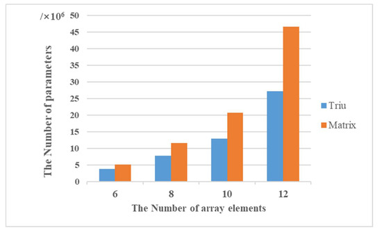 The unfolding process of the fully connected layer is equivalent to a convolution process, where the size of the convolution kernel is equal to that of the feature map, and the number of convolution kernels is equal to the number of neurons in the first hidden layer. Although the neural network structures in these two kinds of input modes are identical, the intermediate variables required in the unfolding process are not the same, due to the different number of elements contained in the two convolution kernels when the feature map in the two input modes is convolved. From the Figure 8, it can be seen that as the number of array elements increases, the intermediate variables required in the unfolding process of the upper triangular array and the square array increase, the gap between them further increases, and the reduction in intermediate variables can speed up the operation process and save operation memory. Therefore, it can be seen from both the Figure 8 and the Table 2 that the advantage of using the upper triangular array (or lower triangular array) as an input compared to the square array is that it can fully extract the matrix features and ensure the DOA estimation performance, while effectively reducing the time complexity and space complexity of the deep convolutional neural network in the training process, thus improving the training efficiency.