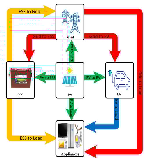 The configuration of the typical smart home is depicted in Figure 1. Besides the utility grid, the smart home under study includes a load profile, electricity price signal, solar radiation, photovoltaic system (PV), an electric vehicle (EV), household appliances, and an energy storage system. In order to achieve an optimal energy scheduling between the power grid and the studied smart home, a smart meter is required to collect information about the power quantity required or supplied to the utility grid [28]. In addition, the smart home energy management system (HEMS) is in charge of optimal energy exchange between smart house components and the utility grid [29,30]. The optimal control problem of energy scheduling between the power grid and the studied smart home entails control inputs as TOU electricity price signal, the specific daily load profile, PV generation profile, EV parameters, and ESS parameters. The control decisions are the power flows between the grid and the studied smart home, state of charge (SOC) of EV and ESS, which have battery charging and discharging power as control variables, and the arrival and departure time of the electric vehicle. The main objective is to reduce the daily cost of electricity and meet the household demand and energy requirement for the EV trip distance, taking into account the necessary constraints. This problem is of great importance because worldwide research on DSM, of which the main purpose is to match generation with demand by managing and controlling the energy consumption, energy storage, and generation on the user side, has opened new possibilities for advanced planning and control of consumption storage and generation, especially at the residential level in which the scheduling of energy consumption storage and generation can play a major role. Figure 2 displays the different combinations of energy exchange paths between components of the smart home.