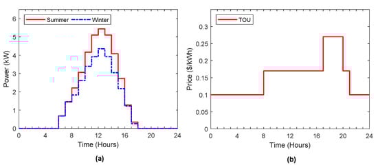(a) Power output curve of solar in summer and winter; (b) TOU price signal.