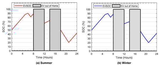 In addition, similar to the ESS SOC constraint, the SOC of the EV should be within a certain range represented by the maximum and minimum state of charge levels as follows.