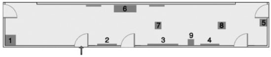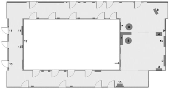Real spaces. Two RSs situated on a university campus were used. Two unfamiliar indoor spaces were selected to show how exploration in the VE or RS affected the acquisition of spatial knowledge by people who are blind. The simple space (Figure 1) was a rectangle of 44 square meters containing two windows, five doors, and nine objects (dark green): a communications cabinet (1), an electric cabinet (2), two mailboxes (3–4), a chair (5), a bench (6), a recycling bin (7), and two boxes (8–9). The complex space (Figure 2) was larger and contained two long parallel hallways with two short parallel hallways connecting the long ones; and 12 objects: two benches (1, 7), staircases (2, 16), recycling bin (3), snack machine (4), two round tables (5–6), chair (8), mailbox (9), window (12), electric cabinet (13), pole (14), and box (15).