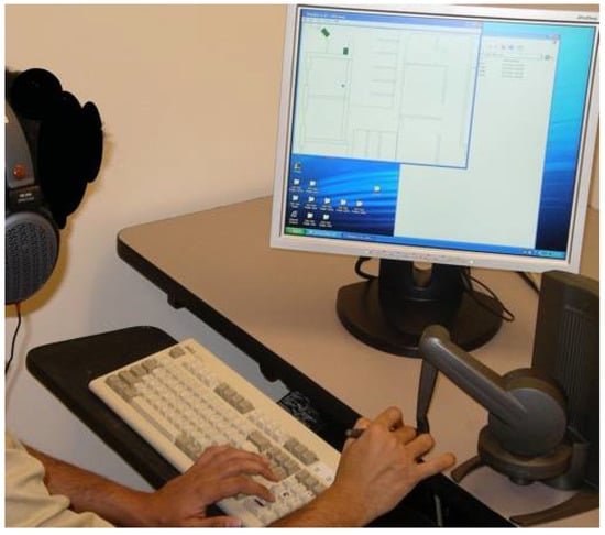 The BlindAid. Development and research of the BlindAid system took place at the MIT Touch Lab as part of a collaborative research project [6,28]. The BlindAid system permits people who are blind to manipulate virtual objects and provides multisensorial feedback. The VE software runs on a personal computer equipped with a haptic device—a Desktop Phantom device (SensAble Technologies, Woburn, MA, USA) and stereo headphones (Sennheiser HD580, Wedemark, Germany) (Figure 3). The Desktop Phantom device provides haptic feedback from the tip of the Phantom, similar to that generated by the tip of a white cane (e.g., stiffness and texture). The haptic device can simulate different degrees of ground texture and stiffness (e.g., marble floor or rubber floor) and the textures and stiffness of different objects (e.g., table or sofa). The system includes surrounding audio feedback that conveys sounds to the users as if they were standing in the VE.