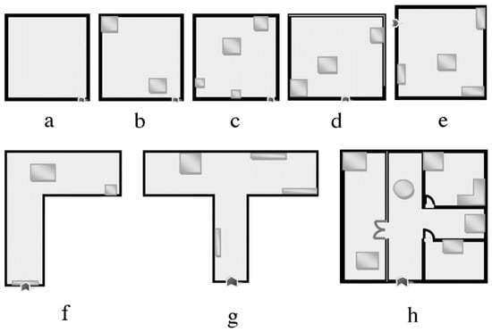 VE training spaces: (a) an empty squre room; (b) a squre room with one object attached to wall, and second located far from the wall; (c) a squre room with three objects in different sizes attached to the wall, and one more located far from the wall; (d) a rectangle room with two objects in different sizes attached to the wall, and one more located in rooms’ center; (e) a rectangle room with three objects attached to the wall, and one more located in rooms’ center; (f) a “L” shape space with three objects: a door, one object attached to the wall, and one more located in spaces’ center; (g) a “T” shape space with five objects: a door and four objects in different sizes attached to the wall; and (h) a squre space devided to three rooms with a corridoe in “T” shape with a door and seven objects in different sizes and locations.