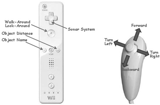 The Wiimote includes tracking technologies (e.g., accelerometer and infrared camera); the Wiimote system permits people who are blind to interact with the remote controller (Figure 6) as a white cane and in addition as a handheld camera in the VE. The VE interface was developed by the Windows-based Wii Controller Interface Suite (WiiCi). The WiiCi tools enable a connection between a personal computer and controller [32].