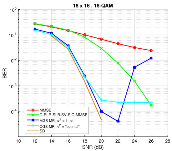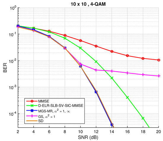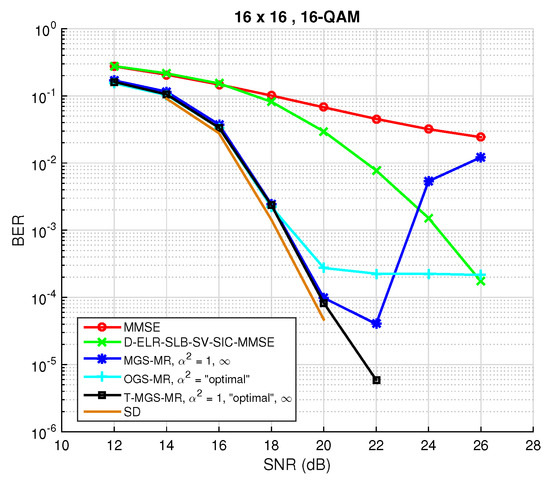 22] (Equation (23)) does not necessary scale for constellations larger than 4-QAM. Further, it can be verified that, with the inclusion of the MR approach, T-MGS performs very closely to the SD, whilst achieving near-optimal diversity for the whole studied SNR range. Again, it is worth emphasizing that the MR instances are parallel-architecture friendly, therefore such hardware design model, increasingly available at the BS, can be exploited to increase speed.