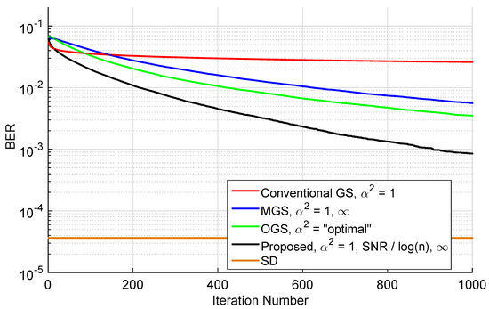 . For comparison purposes, SD performance (which attains ML performance) is also depicted. As can be verified, different mixing ratios exhibit dissimilar behaviors. Firstly, it is confirmed that conventional GS has a rapid decay in BER in the first few iterations, but then becomes stalled in a local minima. Secondly, it is observed that the proposed method T-MGS outperforms both MGS and OGS by a non-negligible margin, thus showing the importance of choosing adequate mixing ratios. Nonetheless, the performance observed in