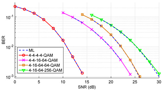 35]. Even so, the AM-MIMO system considered users with 4-QAM, 64-QAM, and 256-QAM. Once again, it can be verified the quasi-optimal performance of our algorithm, proving itself as a viable alternative over SD-based AM-MIMO detectors.