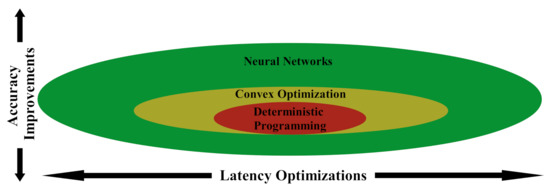 Figure 3). A deterministic program for autonomous waveform design would supply the highest initial accuracy due to the specialization required to create it; however, this programming scheme offers the least accuracy and latency improvements over time due to its rigid design and difficulty programming. Convex optimization, such as the traditional algorithms ERA and RUWO, provides limited improvements over deterministic programming, but these marginal returns flatten out due to the exhaustion of hardware and software optimizations. Barring any breakthrough in convex optimization, these traditional algorithms are unable to meet real-time goals on conventional hardware, leading researchers to turn to artificial intelligence as a possible solution. Neural networks are some of the most popular artificial intelligence techniques for their portability and performance at non-linear function approximation, providing high accuracy when properly trained with sufficient data. Neural networks also, due to their inherent parallelism, boast significant continual latency improvements as new optimizations and hardware accelerators are created. However, neural networks can become saturated when the complexity of their design prevents further accuracy improvements regardless of training duration. Uninformed designs for increasing network complexity, such as increasing network depth, provide diminishing returns, as this increase in accuracy comes at the cost of higher latency times. Tailored neural network designs, such as novel modifications to the network architecture or loss function, offer better accuracy improvements without the significant increase in network latency. It is imperative that a latency-aware neural solution eliminates the need for data pre- and post-processing, as well as keeps the network depth as shallow as possible.