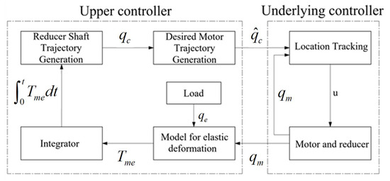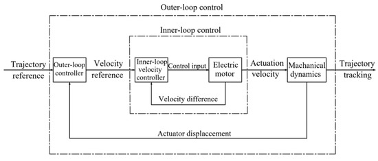 The adaptive robust controller is presented mainly on the premise of (12). The design of the controller contains all unknown elements and uncertainties, and its control structure is divided into two layers, the upper controller and the underlying controller, as shown in Figure 5. The upper controller receives the loading torque measured by the torque transducer and generates the position reference of the servo motor. Additionally, the underlying controller is in control of the servo motor for precise closed-loop position tracking considering the factors such as transmission ratio, which mainly includes the position, velocity and current of the motor three-loop PI controller, as shown in Figure 6.
