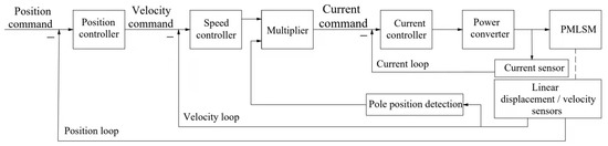 For precise position loading, Chen proposed a method in [7] combining torque compensation with friction estimation that is transmitted from load side to motor side for reference and revision, using an adaptive friction observer based on modified LuGre model to effectively suppress the friction effect in the indirect drive mechanism and improve load side tracking performance. However, this method cannot determine the friction parameters of model, and the ability of compensation is limited. That is, the tracking precision is limited. Wang proposed a neural adaptive PID controller in [8] to solve the precise position tracking failure caused by nonlinearity. Intelligent control methods similar to neural network and fuzzy PID [9] can significantly reduce the static and dynamic errors of tracking, but the high computational cost also becomes the main factor limiting its use. In [10], an improved sliding mode observer (SMO) for adaptive identification based on adaptive control and improvement of cut-off frequency is proposed to fulfill high-precision positioning control of the position servo system with a variable-speed or variable-load. In [11], four realization structures of LADRC in position control of AC system are discussed, and simulation analysis is made on tracking performance. The reference [12] focuses on the influence of the PWM frequency on the dynamics of control loops and position stability and the reference [13] designs Kalman filtering methods based on the extended dynamic model using the fusion of multiple sensor signals, which may be of value to the stability of the proposed controller. In [14], Lee proposed a fuzzy s-curve profile switching method that replaces profile with a more suitable profile for precise driving of the system. Additionally, Younggi Lee proposed a compensation method for precision position-sensorless control using high-frequency pulsating voltage injection [15]. The above methods are effective for precision control but each has certain limits. Aleksej Kiselev extended generalized predictive control (GPC) algorithm [16] based on Laguerre function to track the previously known reference trajectory, which has better tracking performance than field oriented control (FOC) [17,18,19], the standard position control strategy of PMSM, but due to the influences of external interference, model parameter mismatch and finite prediction to time domain, predictive control does not work well on the global system, and the system performance is affected. In addition, the studies on the gain-scheduling control approach are provided. A multiple friction factor model is adopted in [20] using a switched linear parameter-varying (LPV) modeling approach, showing a notable improvement in the system response performance and robustness. One reference [21] proposes the use of a fuzzy gain scheduling (FGS) adaptation mechanism to tune set-point weighted PID controller for the CSTR process, which achieves positive set-point tracking and disturbance rejection. Additionally, both proposed methods are similar in terms of adaptive control to address varying parameters.