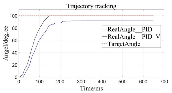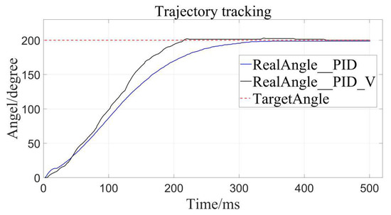 The results are as follows (Figure 8, Figure 9 and Figure 10), the caveat is that the blue solid line named RealAngle_PID represents the traditional PID control, the black solid line named RealAngle_PID_V represents the velocity-sensitive PID control, and the dotted line named TargetAngle represents the position-set point, the same below:
