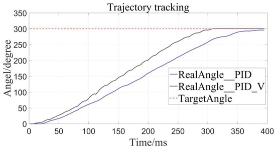 The traditional PID control and the velocity-sensitive PID control are, respectively, used for trajectory tracking, and setting the desired displacements to 100°, 200°, and 300°.