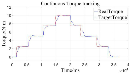 Load loading and unloading are carried out on the device with continuous torques of 0, 2.5, 5, 7.5, 10, 7.5, 5, 2.5, 0 (N·m), respectively. As can be seen from Figure 16 and Table 4, the device can precisely track the given target value well through loading and unloading, meaning that the precision is high in the loading and unloading process.
