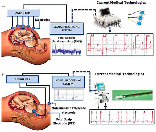 fECG placement and the working principle (a) external electrode (b) internal electrode. “Adapted with permission from Ref. [28], 2012, Martinek, R.; Žídek, J.”.