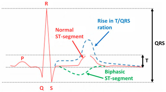 The fECG classification system incorporates a ST analysis (STAN) algorithm for interpretation. It evaluates changes in the fECG complex (Figure 3), most notably the ST segment and T wave [29,30]. Additionally, the T/QRS ratio is analyzed, which indicates the duration of the hypoxic insult in the cells [29] and correlates to the severity of myocardial damage. ECG bradycardia develops immediately as a result of hypoxia and the resulting acidosis. Bradycardia is a critical time marker for delivery, as any delay in delivery greater than 18 min from uterine rupture results in significant morbidity. The ECG should be used in conjunction with other evaluation tools, such as echocardiography and biochemical markers [5].