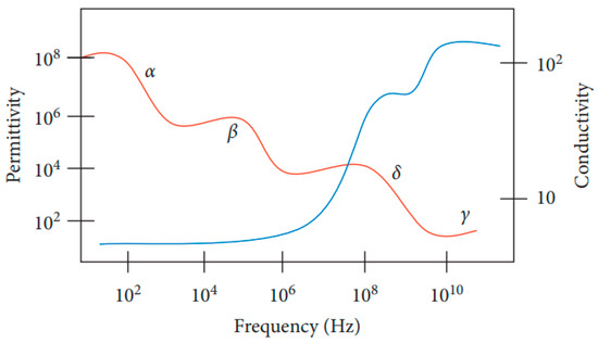The four main dispersion regions are alpha α (10 Hz to 10 kHz), beta β (10 kHz to 10 MHz), delta δ (0.1 to 5 GHz) and gamma γ (above 0.1 GHz) with their respective frequency ranges at low, medium, and high frequency (δ and γ) [42]. The dispersion region depends on the nature of tissues and the extent of their ionic content and ionic mobility. Alpha dispersion is associated with ionic diffusion along the cell membranes. Beta dispersion occurs due to interfacial polarization of cellular membranes, proteins, and other organic molecules. Gamma dispersion is due to polarization of water [43].