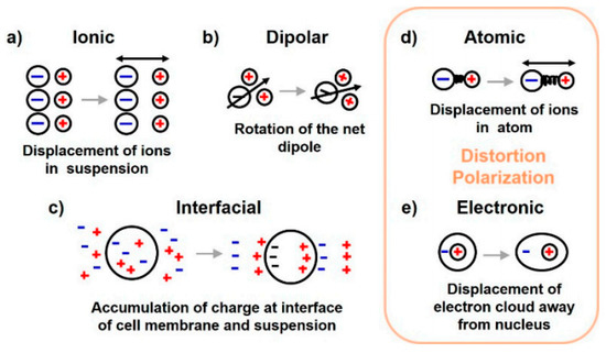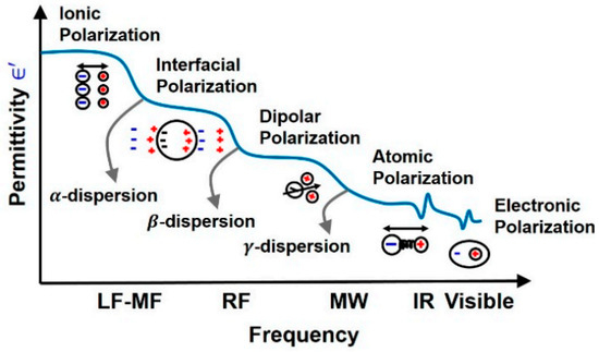 Dispersion regions are divided according to the types of polarization shown in Figure 7. The polarization effect increases with increasing sample conductivity [43]. The order of polarization and relaxation mechanisms are observed when an alternating electric field of increasing frequency is applied to biological matter. Ionic diffusion (a) is observed first, followed by (b) interfacial, (c) dipolar relaxations, (d) atomic, and (e) electronic resonances [44]. The beta dispersion region occurs at the frequency range where dipolar polarization occurs, causing rotation of the net dipole.