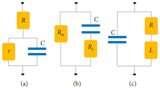 The variation of permittivity with frequency can be explained by using an electrical circuit model in terms of capacitance and conductivity. Scientists have proposed various equivalent RBC circuits [42]. Figure 8a shows Philippson’s circuit where R is the resistance of cytoplasm, r is the membrane resistance, and C is the membrane capacitance [45]. Fricke and Morse proposed a RBC suspension circuit (Figure 8b), where is resistance around the cell and is the resistance of cytoplasm. Cole and Baker worked out an inductive reactance within the membrane structure in Figure 8c. Components of R, L, and C have values of 1 , 1 , and 0.2 , respectively. Cole–Cole dispersion is used to represent the biological tissue as an electronic circuit by a parallel combination of a resistor and a constant phase element (CPE). This accounts for the frequency dependence of each tissue region.
