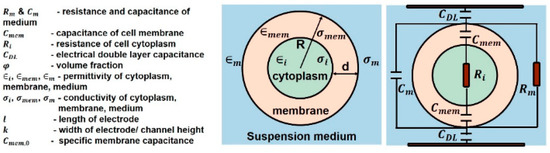 The impedance of a single cell in suspension can be determined by using two parallel electrodes. Figure 9 shows an equivalent circuit model for a single cell in suspension medium. The impedance value of a single cell is derived by using Maxwell’s mixture theory. The impedance of the medium is represented by a parallel resistor and a capacitor . Cell membrane has a very low conductivity, which prevents current flow through the cell at low frequency (<1 kHz). Therefore, the sensitivity of detection decreases as the majority of voltage is dropped across the cell membrane. Hence, this frequency range is rarely used because it cannot provide information about the cell’s properties. Cell cytoplasm is represented by resistor and electrode–electrolyte interface is modeled as capacitor known as electrical double layer . The cell membrane has an approximate capacitance of 1 μF/cm2 [44].
