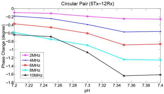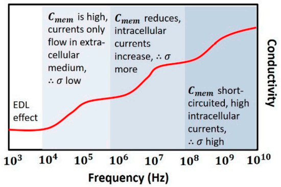 As shown in Figure 10, at low frequencies (<1 MHz), acts as an insulating layer (low conductivity), thus currents flow in the extracellular medium only. The intracellular information is not accessible since currents cannot pass through the cell. When frequency is increased (1–100 MHz), the cell’s capacitive reactance reduces, the eddy current increases, and consequently, conductivity is increased. As the frequency is increased further (>100 MHz), is effectively short-circuited, thus enabling external fields to pass through the cytoplasm. The signal becomes more sensitive to the change in intracellular content and reaches its maximum conductivity [44].
