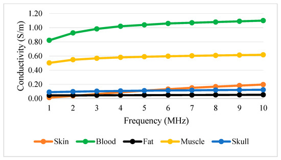 Conductivity is affected by the magnetic permeability of a cell. The magnetic permeability of a material is the ability of a material to support the formation of a magnetic field inside itself, or a measure of the magnetization of a material [43]. Permeability of non-magnetic materials such as biological tissue is considered ( = 1) [39,46]. Magnetic permeability is a scalar in isotropic mediums. Free space has a characteristic permeability constant μ0. Permeability of materials is expressed as relative permeability with respect to free space as in the equation below: