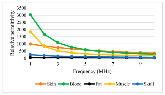 Biological tissue is one of the diamagnetic materials with a weak magnetic susceptibility () around [38] dominated by the presence of water. As biological tissue is exposed to a magnetic field, it will cause interaction of the magnetic field with the tissue, which can be explained by the dielectric spectrum of biological tissue shown in Figure 6. This spectrum provides insights into a sample’s properties and its interaction with the electromagnetic field at cellular and molecular levels over a range of frequencies (permittivity and conductivity).