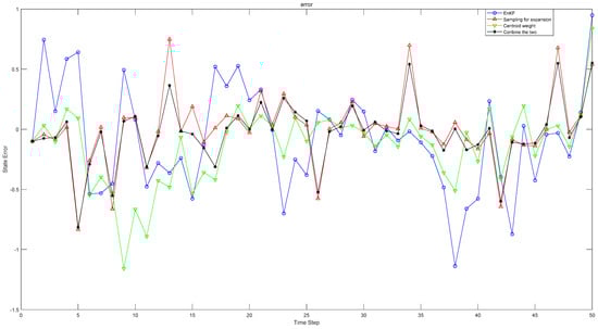 Figure 2 shows the comparison results of the errors of four methods when . Table 3, Table 4, Table 5 and Table 6 show the results when and are constants and the nonlinearity of the system is changed by . When , in Table 3, the approximation error of state in the original EnKF method is 0.1064, and the approximation error of the expansion sampling method is 0.1056. In contrast, the EnKF of the expansion sampling method is increased by 0.75% compared with the original. Under the original sampling method, the approximation error of the confidence weight is 0.1055, which is 0.85% higher than the original weight. The approximation error of the method proposed in this paper is 0.1050, which is 1.32% higher than the original EnKF. In the estimation error analysis in Table 4, under the original weight the expansion sampling method is 5.85% higher than the original EnKF; under the original sampling, the confidence weight is 6% higher than the original EnKF, and the centroid weight expansion sampling method is 45.44% higher than the original EnKF. As can be seen from the table, the effect of improving the two methods is better than changing only one. The experimental results show that the approximation error is reduced, the corresponding estimation error is also reduced, and the filtering effect is significantly improved. Similarly, in Table 5 and Table 6, the status has the same effect. Moreover, as can be seen from Table 3, Table 4, Table 5 and Table 6, with the enhancement of nonlinearity, the filtering effect of the method proposed in this paper is still very good. This experiment proves that the estimation error can be reduced when the approximation error is reduced. By reducing the approximation error and estimation error, the filtering accuracy is improved, and the feasibility of this method is verified.