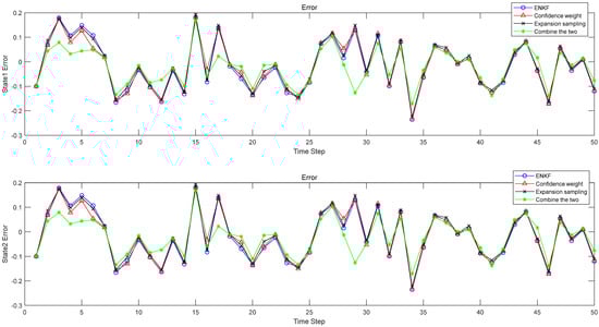 where, , , are all Gaussian white noise sequences obeying a distribution of , assuming an initial true value of , an initial estimate of with initial estimation error covariates , and is a parameter that regulates the degree of nonlinearity in the nonlinear system. The original EnKF method was contrasted with different methods separately, and the experimental results are shown below: