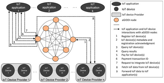 IoT applications and IoT device providers can interact with aGIDDI via the sub-services in any of its nodes. For example, as illustrated in Figure 1, an IoT Device Provider may register its IoT devices via a specific aGIDDI node but forward IoT device data via another node. Similarly, an IoT application may query, pay, and integrate IoT devices via sub-services in different aGIDDI nodes.