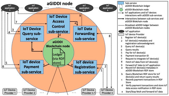 - IoT device registration, IoT device query, IoT device payment, and IoT device access control sub-services, which allow IoT applications to query IoT devices are controlled and maintained by other parties (which we refer to as IoT device providers), integrate such IoT devices and their data observations, and pay for these. The IoT device data forwarding sub-service, which manages the flow of IoT device data from the IoT devices to the client IoT applications, is autonomically controlled by the IoT device access control sub-service. All aGIDDI sub-services use the aGIDDI Blockchain to manage and distribute the IoT device metadata (which, as we noted earlier, are used exclusively for IoT device description, query, integration, and payment) across all aGIDDI nodes. The aGIDDI sub-services are discussed further in Section 4.