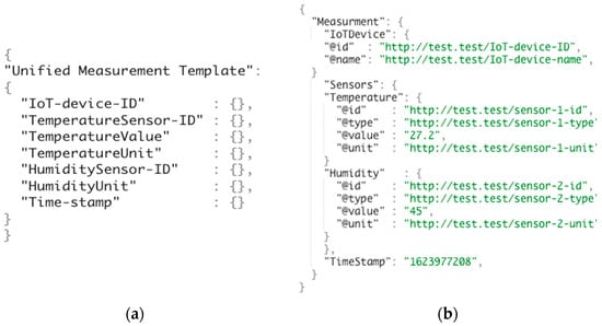 (a) Unified measurement template in IoT device metadata; (b) measurement of thermometer with two sensors example.